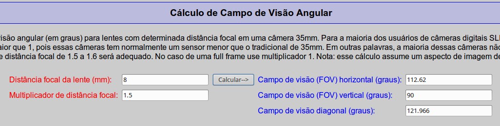 Se quiser ver mais detalhes, vejamos os ângulos de visão angulares na sua câmera usando a calculadora pra isso: