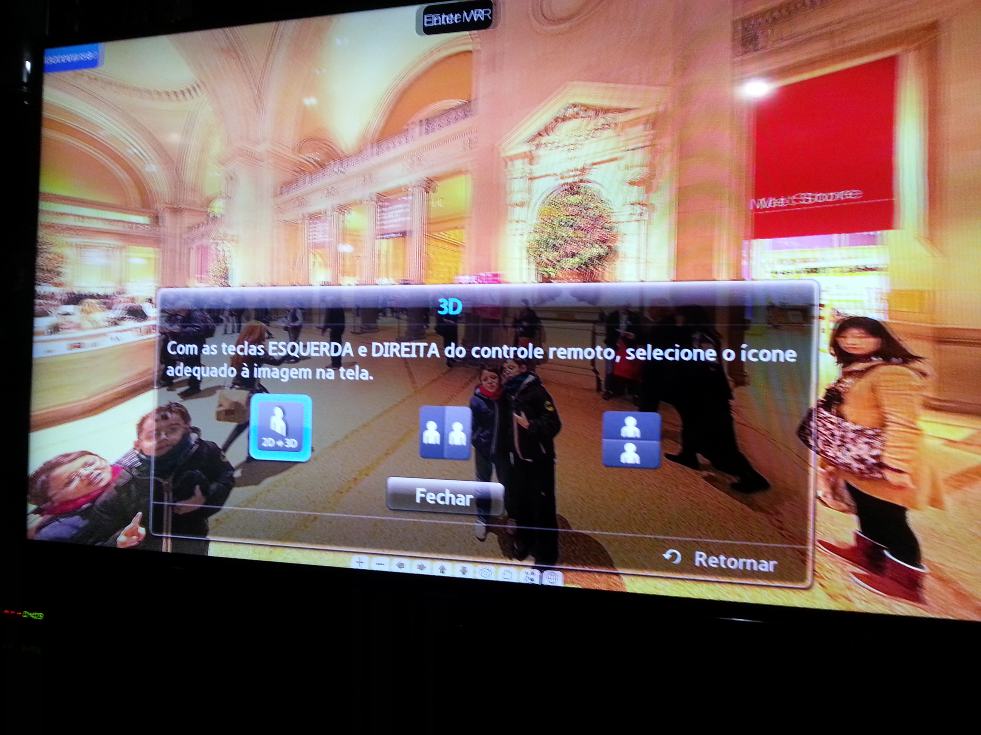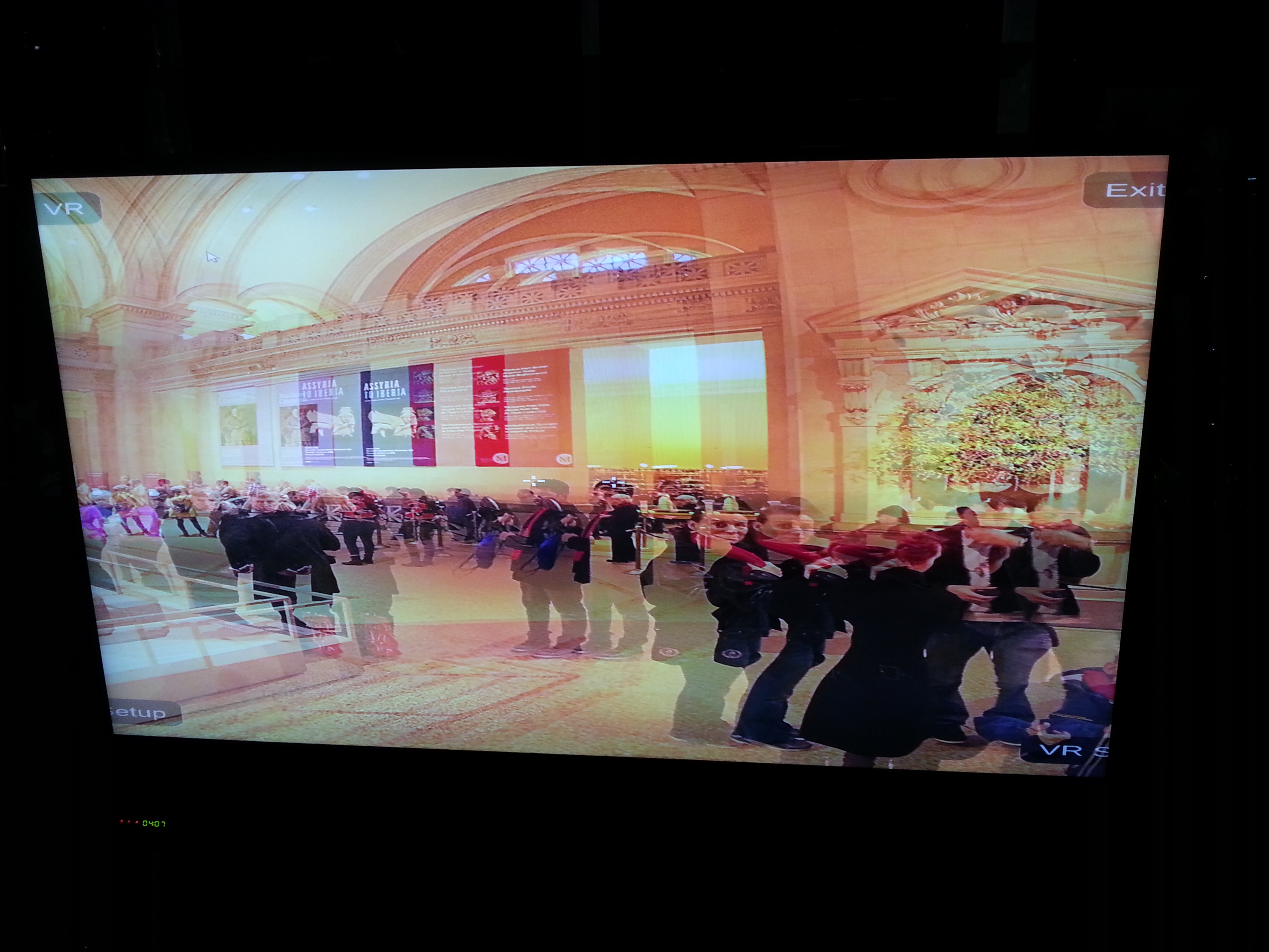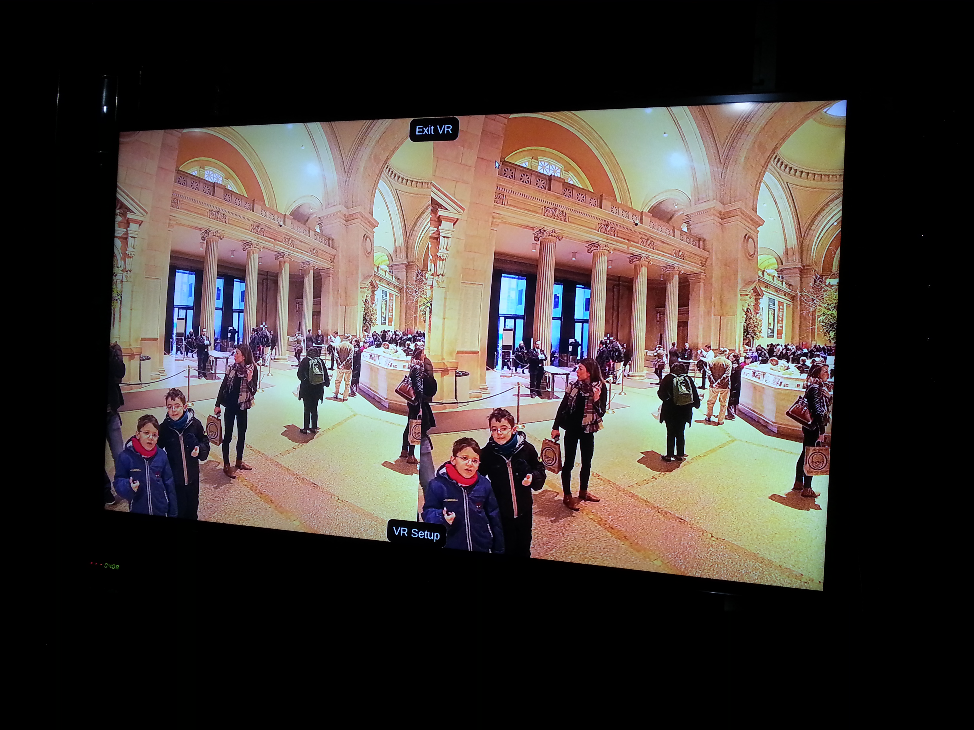 Duas imagens vindo do computador, geradas pelo Krpano após clicar em "Enter VR" 3D apresentado na TV a partir das 2 imagens. Com os óculos fica perfeito. Em outro teste não usei a geração de duas imagens feita pelo krpano. Apenas transmiti a panorâmica com o navegador maximizado para a TV. Ela tem um modo de 3D que consiste em converter uma imagem única numa imagem 3D, que foi o que testei.
