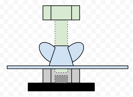 O L vem logo em cima, com o parafuso (verde) passando por ele e a porca borboleta apertando ele sobre a porca.