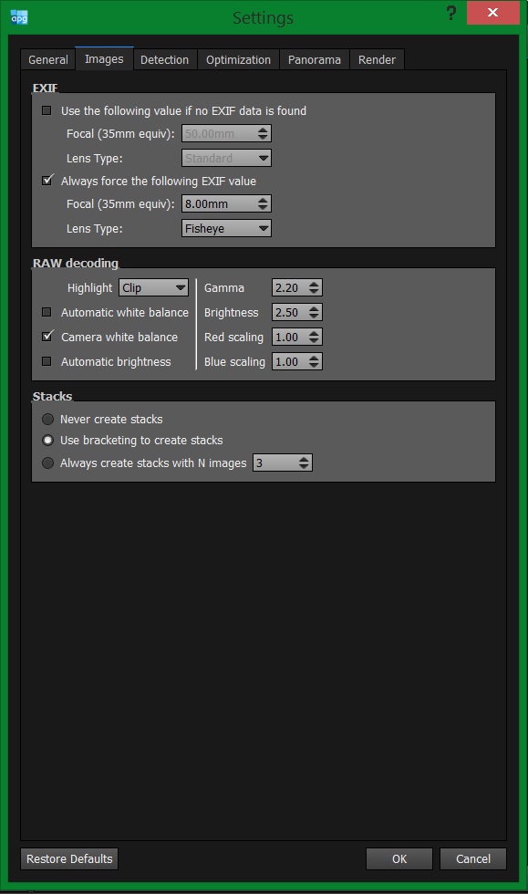 Veja ainda outro detalhe fundamental, acho até que mais do que acertar direitinho os valores: classificar o tipo da lente. Se deixar como Normal (retilinear) e as fotos forem de uma olho de peixe não vai dar certo nunca!!!!
